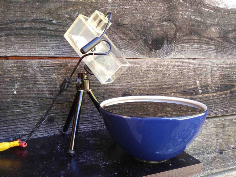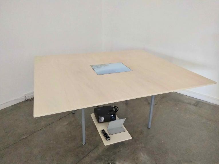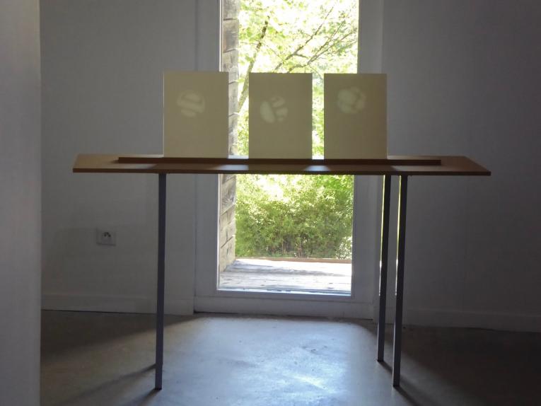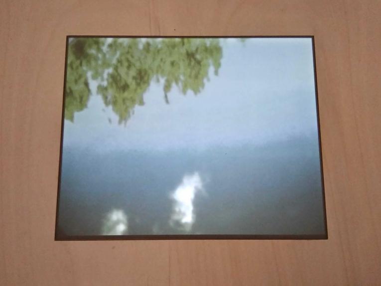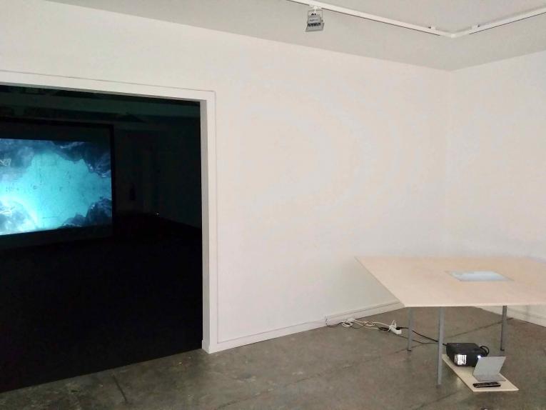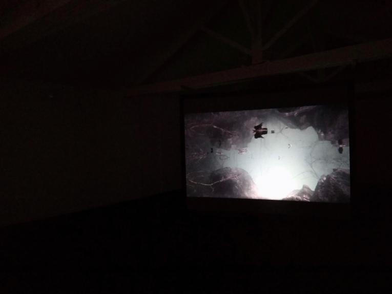 Nella mostra di Alessandro Quaranta al Cairn di Digne, intitolata “Univers inferieur”, ciò che sta fuori si può vedere da una finestra che si trova sul lato Sud del Cairn, l’unica lasciata aperta (le altre sono state chiuse per creare il buio necessario alla proiezione del video Les animaux de Stella, nella sala grande), ma anche sul tavolo dell’opera I non illusi errano, sullo schermo orizzontale che ci permette di vedere l’immagine riflessa sulla superficie del liquido contenuto in una tazza posta su una mensola fissata a un muro esterno. La vediamo in tempo reale, è mobile, viva, vediamo mentre siamo all’interno quel che sta accadendo fuori, in una minuscola porzione del reale: la tazza è il terzo occhio di ogni visitatore che guardi verso lo schermo sul tavolo, e questo tipo di visione corrisponde alla “soggettiva” di certi rari film, quando vediamo ciò che vede il protagonista, con i suoi stessi occhi.