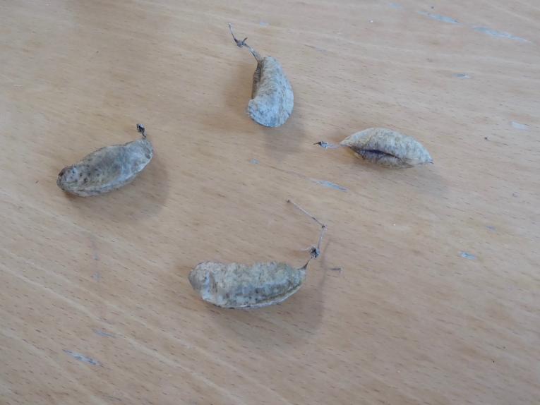 Stamattina, mentre uscivo dalla cucina andando verso il bagno, ho sentito dietro di me un rumore, flebile, frusciante: qualcosa doveva essere caduto sul pavimento, oppure sul tavolo, qualcosa di molto leggero, come un ramoscello con qualche foglia secca, ma poteva anche trattarsi di un piccolo animale. Tornando sui miei passi, e guardando in giro, ben presto notavo, sul pavimento, le forme dei quattro involucri contenenti i semi raccolti a Digne, sparsi sul pavimento in un’area limitata, formando una figura a rombo, quasi perfetta, circa 40 cm la sua diagonale maggiore, circa 20 quella minore. Ci ho messo pochi secondi a capire cosa era accaduto: stamattina (o piuttosto ieri sera? non riesco a ricordarmene, ora) avevo tolto la giacca impermeabile dalla borsa che la conteneva, nel corridoio, appendendola a una gruccia a sua volta appesa alla struttura del soppalco, e quando sono passato lì accanto, toccandola inavvertitamente, i quattro semi, in precario equilibrio all’interno delle maniche, pressati dall’azione lenta ma inesorabile della forza di gravità, erano caduti a terra, producendo quel lieve rumore che mi aveva talmente sorpreso.