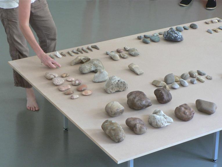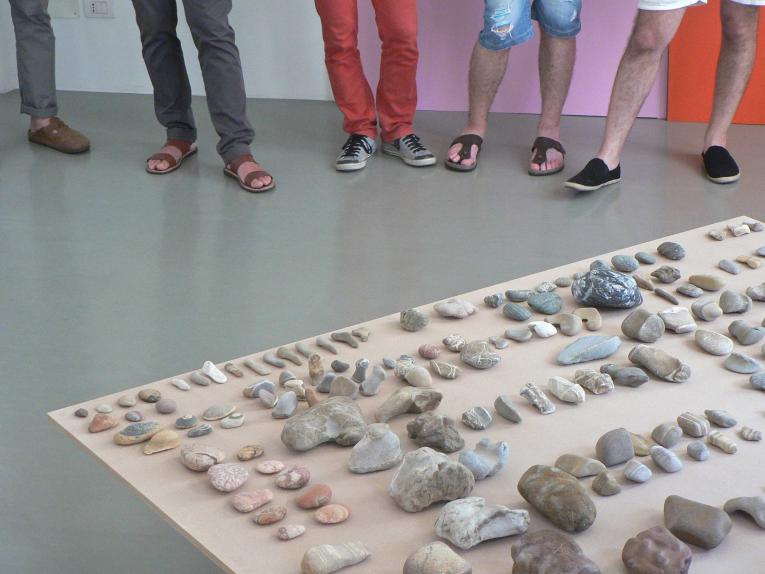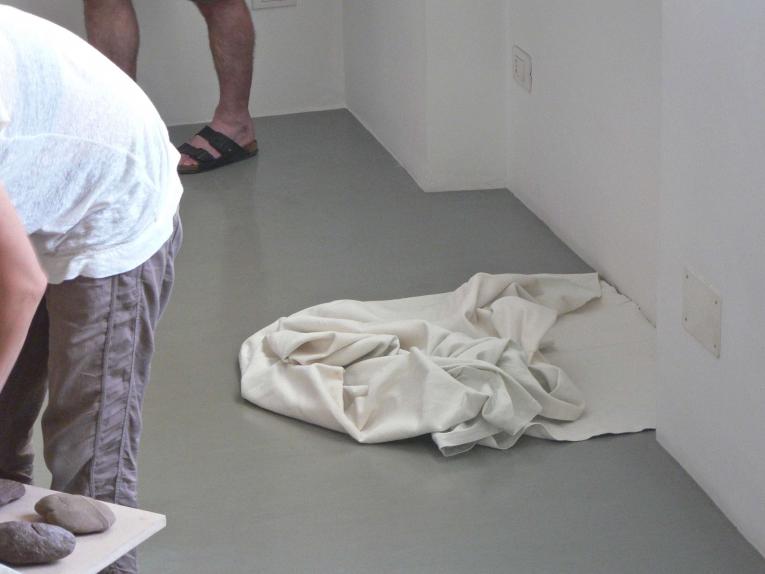 Sabato 4 luglio 2015, a blank, Andrea e Raffaella hanno rappresentato e rievocato in una forma nuova la loro azione di ricerca e raccolta delle pietre nel Wachau, fra la fine del 2014 e l'inizio del 2015. Molte di quelle pietre sono state preventivamente deposte in un angolo dello spazio, nascoste da un grande telo bianco, che avrebbe impedito al pubblico di vederle, prima dell'inizio della performance. Lì vicino, un grande tavolo rettangolare in mdf, montato su sei gambe in ferro, avrebbe accolto tutte le pietre estratte a turno dai due performer dal loro provvisorio deposito, al di sotto del telo bianco. Così, per circa 40', una danza lenta e muta – soltanto l'intermittente e lieve tintinnare delle pietre quando talvolta si toccavano turbava il silenzio – si è svolta davanti agli occhi degli astanti, mentre Andrea e Raffaella, scalzi, toglievano i sassi dal caos nell'angolo, riponendoli sul tavolo a formare nuove composizioni, nel breve percorso dal buio dell'indistinto alla chiarezza di un sistema ordinato.
