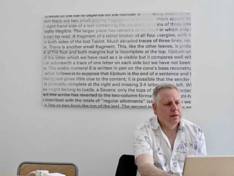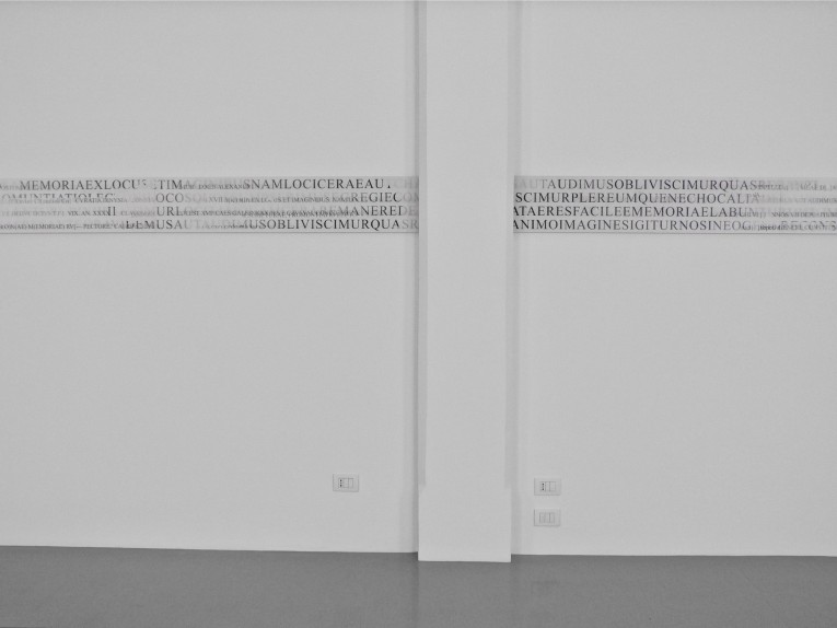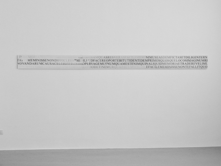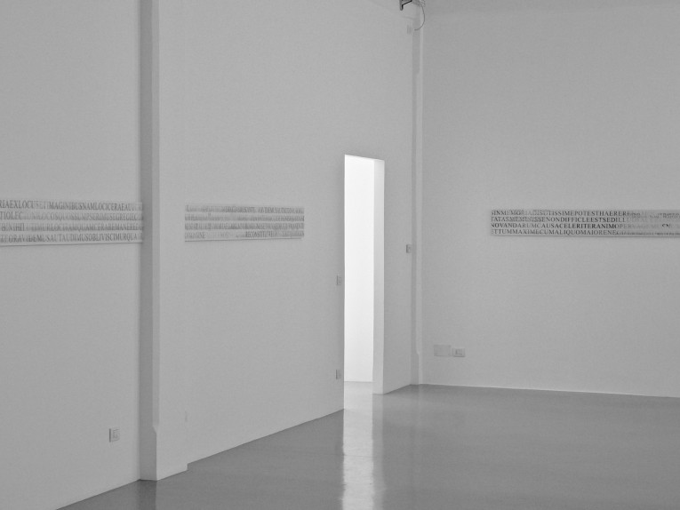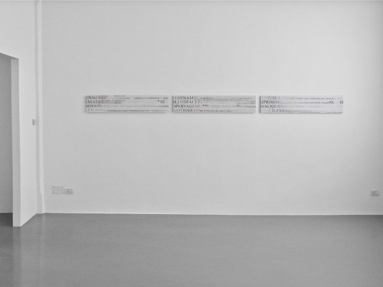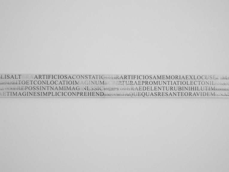 Il nuovo lavoro in mostra, Speak Stones, contiene testi che provengono da antiche iscrizioni epigrafiche romane, oltre a un testo anonimo in latino (spesso attribuito a Cicerone) sulle tecniche di memorizzazione, Rhetorica ad Herennium. Questo lavoro è in relazione con la precedente serie Epigraphica Ephemeris, che Dreyblatt ha presentato in una recente mostra collettiva alla Hamburger Banhof, Translation. Text as Image, comprendente lavori di cinque artisti che si riferivano all’opera di Walter Benjamin. L’artista scelse in quella occasione di utilizzare, per la prima volta, una tecnologia detta ‘lenticolare’, un metodo interattivo di visualizzazione. Ogni lavoro contiene fino a cinque diversi strati di testo, tutti leggibili semplicemente variando il punto di vista, cioè spostandosi nello spazio, e che sembrano sovrapporsi gli uni sugli altri come in un palinsesto.