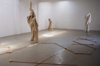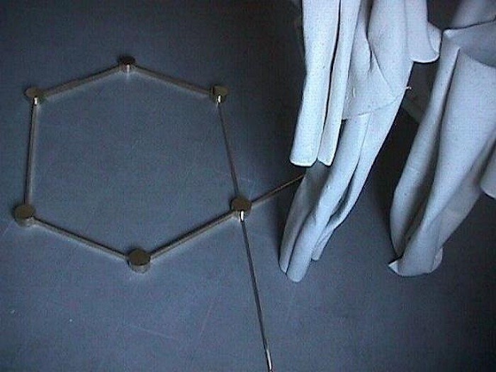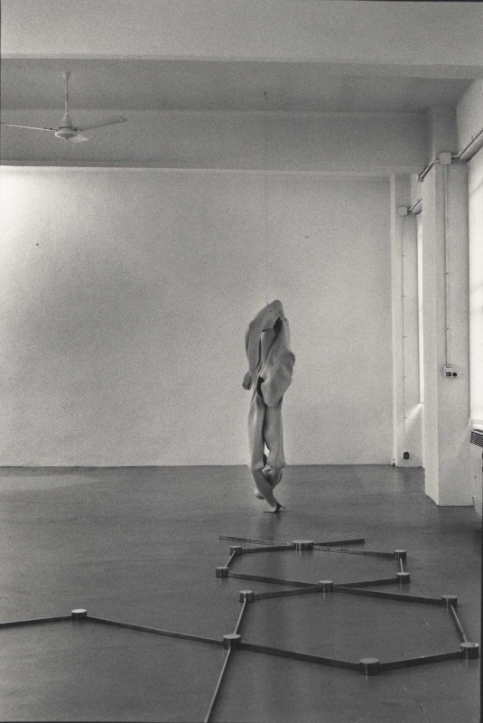 Venerdì 9 aprile 1999 e/static inaugura, nella sede di via Parma 31 a Torino, la sua prima mostra in assoluto. Si tratta di un progetto originale, appositamente concepito per il grande spazio espositivo e realizzato insieme da Daniela De Lorenzo e Addo Lodovico Trinci. I due artisti toscani (De Lorenzo di Firenze, Trinci di Pistoia), invitati dal direttore artistico, Carlo Fossati, dopo un primo sopralluogo nello spazio espositivo, avvenuto lo scorso dicembre 1998, hanno collaborato intensamente per alcuni mesi giungendo infine all’ideazione di una messinscena assai rigorosa basata su alcune opere in feltro della De Lorenzo e su una struttura in ottone polito ideata da Trinci. In pratica, la prima è intervenuta nell’aria del luogo, appendendo al soffitto quattro sue sculture in feltro (due delle quali formano un gruppo), altrettante figure umane che poggiano sul pavimento, indicando tutte la verticalità, sia pure tortuosa. Trinci ha invece utilizzato soltanto il pavimento, appoggiandovi una complessa struttura basata sulla prediletta figura dell’esagono (richiamante anche una struttura chimica, e quella degli alveari), oltre a una sorta di eco luminosa, di forma sempre esagonale, stabilita dalla proiezione, sempre sul pavimento, di uno spot sagomatore da teatro.