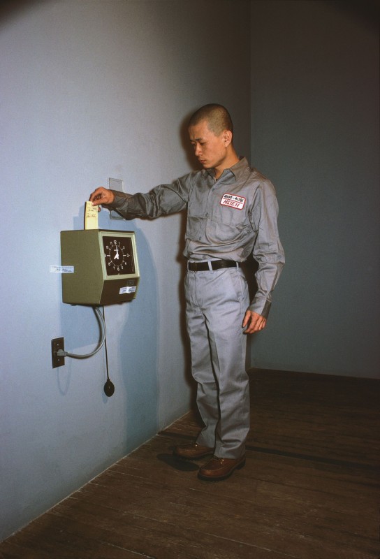 La performance del 1980-81 di Teching Hsieh (uno degli artisti in mostra, americano di origine taiwanese, nato il 31 dicembre del 1950, ha ufficialmente smesso di fare arte il 31 dicembre del 1999) durò esattamente un anno, durante il quale l'autore doveva timbrare, allo scadere di ogni ora per tutti i giorni, una cartolina emessa da una macchina bollatrice da ufficio, per testimoniare così il rispetto dell'impegno preso, compiendo un atto assolutamente gratuito, senza alcun legame con un qualsiasi lavoro retribuito. La performance fu documentata da una foto-camera, che scattò diverse migliaia di immagini, 24 (salvo sporadicissime, involontarie, eccezioni) per ogni giorno, e il film di animazione in 'stop-motion' realizzato con quelle immagini, della durata di circa 6 minuti, è un prodotto fantastico, lo scarto insignificante di un anno di vita, tutto dedicato a quell'unica in-utile occupazione. Hsieh realizzò fra la fine dei '70 e gli '80, oltre a questa, alcune altre performance “di un anno” (one year performances): in tutte è immancabile, e fondamentale, la presenza della figura del testimone, colui o colei che assiste all'evento (o a parti di esso) e ne certifica la verità.