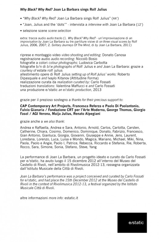 “Why Black? Why Red? Joan La Barbara sings Rolf Julius” contiene la documentazione video integrale della performance omonima, che ebbe luogo il 15 dicembre 2012 al Museo del Castello di Rivoli, nell'ambito di Rivolimusica 2012-13. Pubblicato lo scorso 28 aprile in 500 copie, di cui le prime 50 numerate e firmate dalla stessa Joan La Barbara, il dvd contiene anche una preziosa intervista alla grande 'vocalist' americana, alla quale Carlo Fossati e Maija Julius hanno rivolto alcune domande, sia sulla sua lunga relazione artistica con Rolf Julius, sia sulla genesi di questo progetto dello scomparso artista tedesco. Una storia durata 30 anni, a partire dai primissimi anni '80, quando per la prima volta Julius propose a La Barbara di improvvisare sulle sue partiture visive, in occasione di una sua visita allo studio berlinese dell'artista, e che soltanto lo scorso anno ha potuto essere coronata con una performance pubblica della cantante americana su alcune sue grandi partiture.