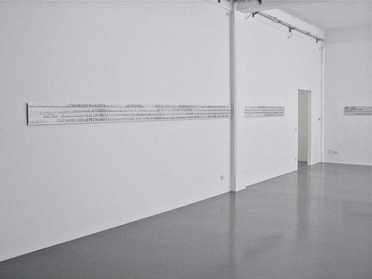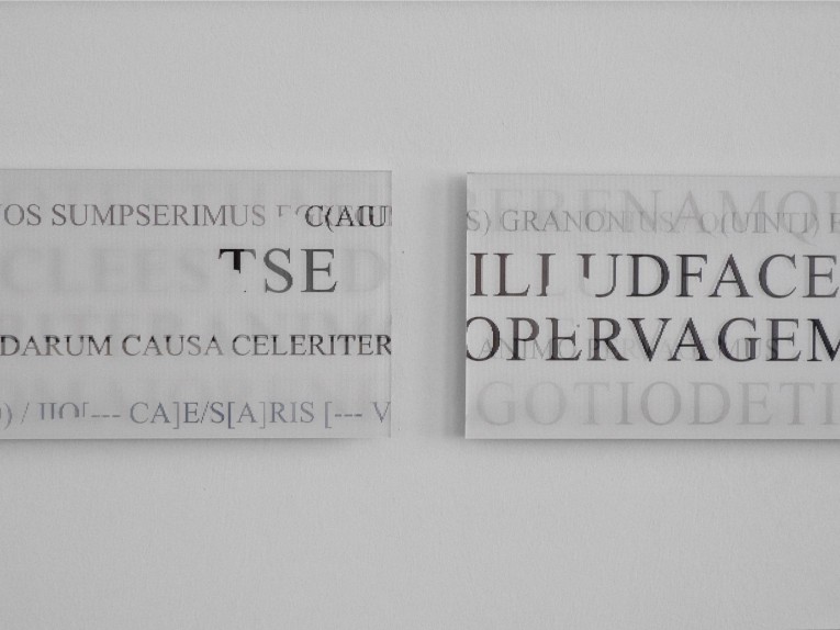 The new work, Speak Stones, contains texts which are derived from ancient roman epigraphic inscriptions and an anonymous early latin text on memory-technics, Rhetorica ad Herennium, often attributed to Cicero (1st Cent. B.C.). This work is related to Dreyblatt's previous series, Epigraphica Ephemeris, which was recently shown in an exhibition of works referring to Walter Benjamin: Translation, Text as Image at the Hamburger Bahnhof in Berlin in 2006-2007. Lenticular technology was chosen for these works as an interactive means of display. Each work contains up to five text layers, which are viewable as text fragments from varying viewing positions, and which seem to ‘overwrite’ each other as in a ‘palimpsest’.