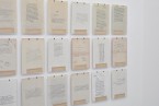 In the installation The T Documents (1992), the artist's personal selection of 81 original archive documents have been digitized and faked by specially developed printing techniques applied to the reverse side of East German archival pages. The documents are displayed in chronological order in transparent envelopes hanging on metal hooks.