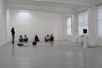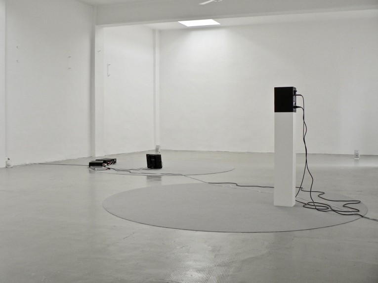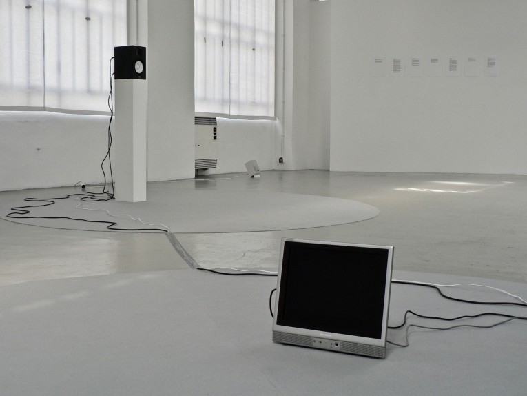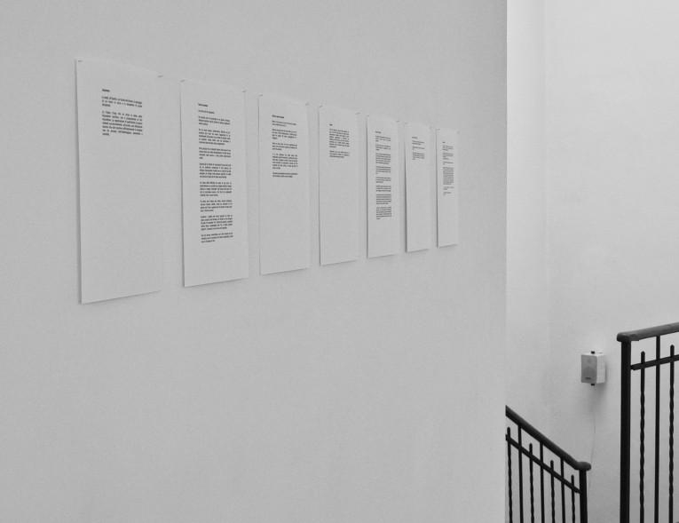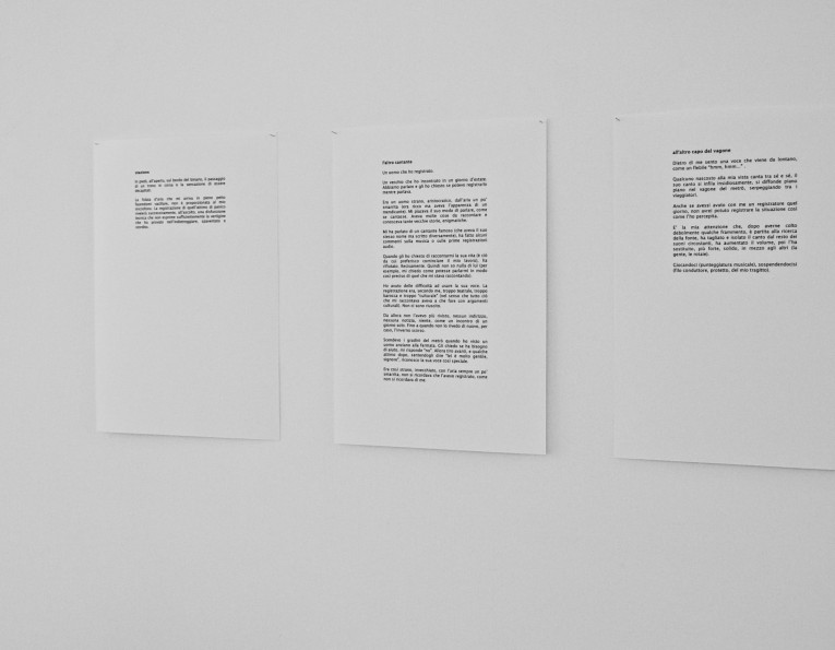 In the artists's words, Petitgand's exhibition for e/static "articulates various forms of apparition connected to words, text, sound, the acts of listening and reading (not to mention their multiple echoes): voices, subtitles, comments, music. The work is comprised of a bi-lingual sound installation (of a number of stories recounted in French and Italian and set to music) together with a series of texts ("Les pièces manquantes/the missing pieces", on seven pieces of paper affixed to the walls). The sound pieces are designed to set in motion a specific relationship with the gallery space, creating the possibility for different levels of reading and listening, an intuitive, sensorial and poetic approach to the stories that is progressive in character, composed of different stages and directions".