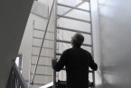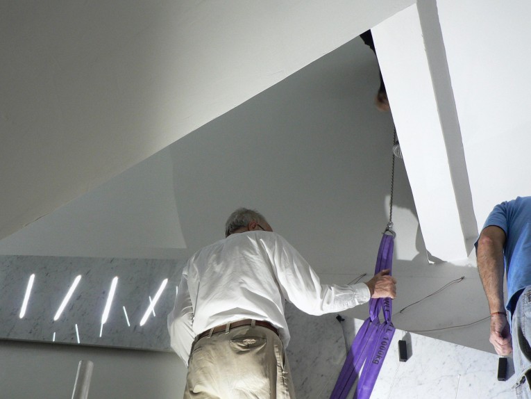 In November 2006, the German artist Hans Peter Kuhn (author of two solo exhibitions with e/static, in 2005 and 2008, as well as Advertising, a large 'light and sound' installation presented in the "Constellations" section of Artissima in 2005), was commissioned by a Turin collector to make an important - and almost unique in its kind, at least in Italy - permanent installation project with lights and sounds, Helix, which was inaugurated on the occasion of the inauguration of a newly renovated building in Via Reggio 27 in Turin. This was a very demanding work, which required lengthy planning, then its execution and set up placed in the stairwell of the building, presented still without the sound part, which was to have been part of the original project but its execution was postponed. Exactly 12 years after the first inauguration, thanks to the owner's desire and the enthusiastic availability of the artist, the now completed work will finally be presented to the public on the evening of Friday, November 2. So as of that evening "Helix will talk!", or rather, will emit its voice, with a composition of sounds created specifically by the artist. The work, which has also been subjected to a 'freshening up' of the entire lighting component, will appear to the viewers in a renewed form, although the marble frieze/support remains unchanged, with its elliptical development that runs along the entire stairway, interacting visually with lights and sounds.