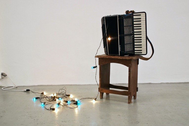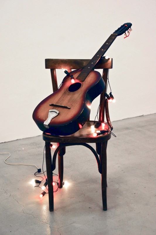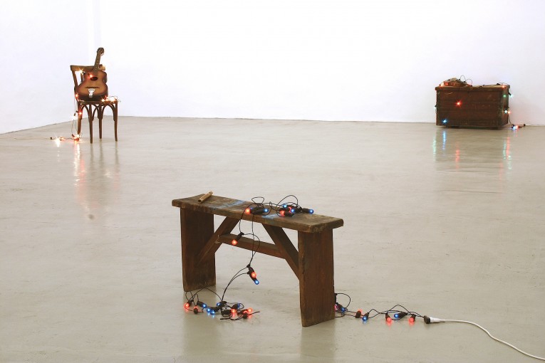 Since that first evening, seven other works have been added to the series, making use of an equal number of traditional instruments: mandolin, shawm, tambourine, piccolo, chiamu, guitar, tirititì. These have been played in Catania, Paris, and Milan, in conjunction with garlands of coloured lights representing the various locations, and a particular object which is different each time but linked to a specific social function, such as a kitchen table, a wardrobe, a stool, a small table, a writing desk, a seat, a coat-rack. Each of these performances has taken its name from another of the Muses: Thalia, Calliope, Euterpe, Terpsichore, Urania, Clio, and Erato.
