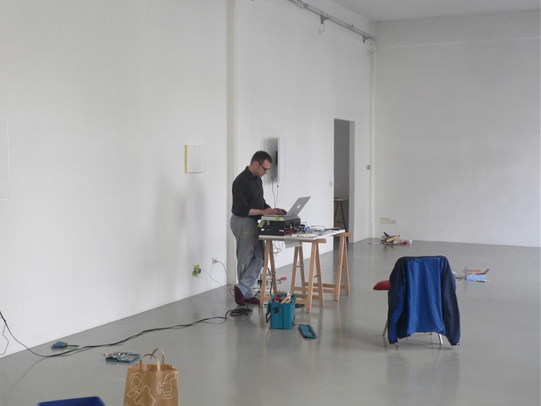 The opening reception which will take place at blank on the evening of Saturday 5th November 2016, starting from 8.30 pm, during the Notte delle Arti Contemporanee (Contemporary Arts Night) will mark Michael Graeve’s second solo exhibition for e/static. The very title of his first one – “Spatial Choreography” – held in 2010, clearly conveyed one of the distinctive traits of this Australian artist’s approach to art, his being both a painter and a maker/manipulator of sounds and noises: his excellent sense of space, and his ability to co-opt it into a system of signs which require to be experienced rather than simply observed. On that occasion, the components of the installation were meant to be searched for, indeed, by moving through space, and could be found anywhere, on the walls, on the floor, on the ceiling. Every now and then, the visitor would be surprised by the appearance of a composition of sounds and noises which subverted – or, to say the least, challenged – for a few minutes, any spatial certainty they may have acquired during their exploration of the exhibition area, while walking and looking all around.