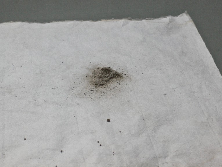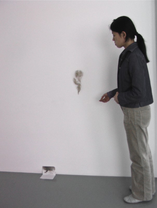 But Yui’s work (as the video she presents for the new show testifies) also springs from an intuition similar to that of Jospeh Beuys’ 1972 work, Ausfegen: the residue of an event, or a number of successive events that in its piling up outlives the event itself, represents by its form which is the result of its passage from a formless state (the little mound of dust and dirt gathered on the floor of the Singhur like the pile of waste materials swept up and collected by Beuys after a political demonstration) something that has taken place, something that has been and is no longer, leaving in its wake only this small ‘trace’. What might be ashes or dust or sounds recorded and then modified, remade; and in a similar manner the photos (of Yui’s kitchen-garden or of one of her own installations) that she presented in the form of ink-jet prints for her first show in Turin, after computer-processing them to the point where they were almost completely unrecognizable, still indissolubly linked to the things they represented.
