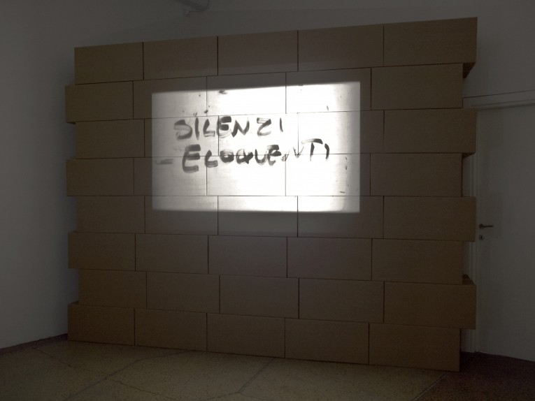 The artist wanted to dedicate this project to the topic of memory, which he deals with in its most physical dimension, going against the trend of its increasingly virtual and solely mental fruition. The latter is by now prevailing more and more with the widespread use of electronic means of communication, and the shift to the 'web' - this abstract and elusive super-individual entity - of a responsibility that should maintain its individual and experiential character instead. These concepts are clearly expressed by Piscitelli himself in a recent text: “Over the last couple of years I travelled a great deal and I even moved a few times leaving behind, at friends and relatives, cardboard boxes stuffed with books. Here in Texas, where I now live, I casually started creating a sort of catalogue of these distant bodies. The effort to remember versus the chaos of memories. Last year, I noticed how during my classes, my students would look up books or quotes on the internet with their cell phones or computers. I didn't see the trace of the slightest effort on their faces. On the other hand, at home, I carried on straining my memory, creating kaleidoscopic architectures of recollection by writing titles, notes and free association of thoughts. At a certain point, I decided to film my performances with a camera. At first, the subject of my shots was only the shadow of my hand writing with a felt-tip pen on an overhead projector, then I decided to get other people involved, driven by curiosity and the desire to share with someone else the weight of the immense effort of recollection. Thus, “Unpacking” was born, as a series of performances consisting in the recollection of read, lost and/or loved books, with the subsequent digressions, uncertainties and free associations. The video installation “Unpacking” is made up of videos projected on one or more surfaces consisting of empty cardboard boxes placed one on top of the other, as if to build a wall. “Unpacking” performs the kaleidoscopic architecture of memory by means of writing the titles of read, lost and/or loved books, notes and free associations of thoughts. Each performer, without any time limit, found herself/himself writing with a felt-tip pen on an acetate sheet projected by an overhead projector...” (P. Piscitelli, 2009).