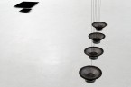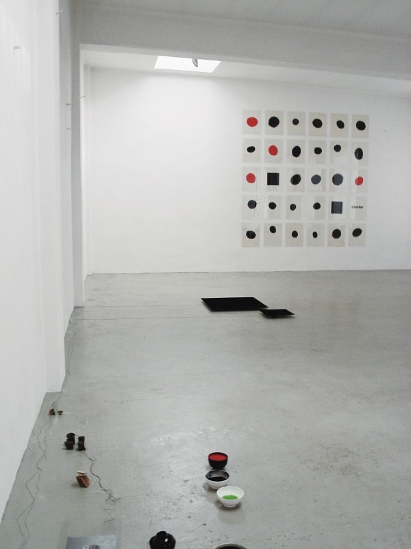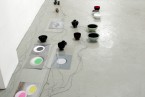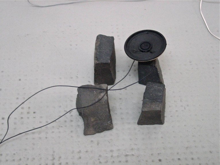 Julius also integrates these loudspeakers with other raw materials, such as stones or water, and diverse devices, such as glass or metal sheets, clay pots, bowls, japaneze cups, woks, which resonate or act as sound diffusers. Through these elements, supporting the music diffused by loudspeakers, the conceived sound becomes concrete. They reveal the sound, act as traps for the eye. Attracting the viewer’s glance, they allow her/him to hear through the organ of sight what otherwise would eventually be perceived as a noise, due not only to the low volume but to a so-called perceptive supremacy of the eye. Approaching the works, the listener-viewer is able to distinguish and make sense of the music diffused by the speakers. For Julius this experience of the listening has a concreteness which opposes the abstractness of musical writing, just as the sound itself is concrete, a palpable, physical thing, lived as such.
