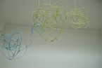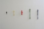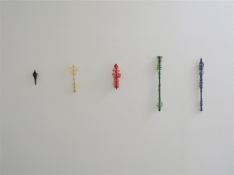 Drawings, paintings, sculptures, a sound installation: diverse parts that center around the idea, fundamental to his work, of translation (cups into clouds, songs into rain...).The most emblematic of all is Vowels, presented here in a brand new version, created expressly for this exhibition, in which the sung sounds of the five vowels pass through a computer graphic visualization, and are transformed into the same number of sculptures, each colored according to the associations formulated by Arthur Rimbaud in his famous poem, Voyelles.