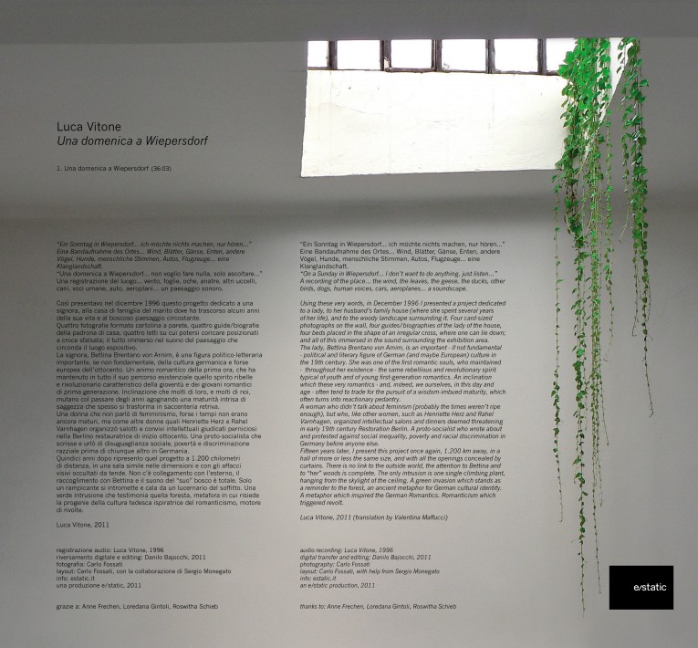 Lo scorso 5 novembre 2011 è stato presentato a e/static, in via Parma 31 a Torino, il cd "Una domenica a Wiepersdorf", tratto dalla mostra omonima (vedi QUI) di Luca Vitone, a cura di Carlo Fossati. Il cd è stato pubblicato in 500 copie e contiene il file audio che si poteva ascoltare visitando la mostra allestita proprio ad e/static (chiusa quel giorno stesso, dopo essere stata aperta il 27 maggio di quest'anno), una registrazione effettuata dall'artista nel dicembre del 1996 mentre si trovava a Wiepersdorf, per un periodo di residenza. Vi si trovano molteplici suoni, tutti quelli che formavano il paesaggio sonoro di quel giorno nei dintorni del Künstlerhaus Schloss di Wiepersdorf, in Brandeburgo, quella che fu la dimora di Bettina Brentano Von Arnim, grande scrittrice e poetessa tedesca del primo '800.